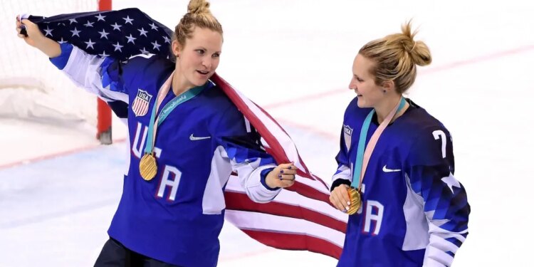 USA women’s ice hockey gold medal winners Jocelyne Lamoureux, left, and Monique Lamoureux-Morando after beating Canada at the 2018 Winter Olympic Games in Gangneung, South Korea.  (Harry How/Getty Images)