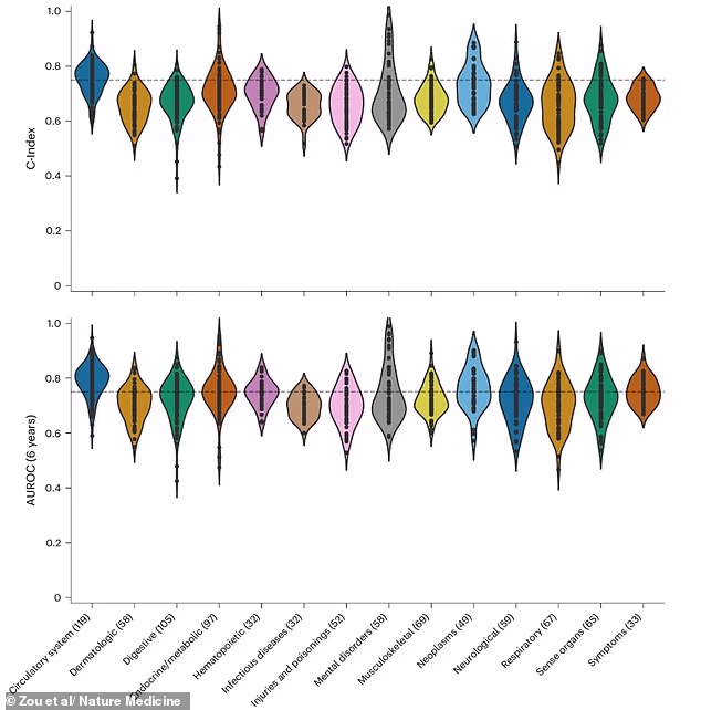 The model’s predictions were particularly strong for cancers, pregnancy complications, circulatory conditions and mental disorders.