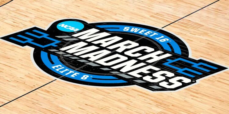The Sweet 16/Elite Eight March Madness logo is displayed on the floor before the NCAA men’s basketball tournament Elite Eight game between Texas Tech and Florida at the Chase Center in San Francisco, Calif., on March 29, 2025. (Mitchell Layton/Getty Images)
