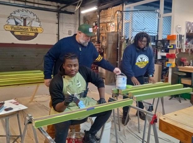 Pullman Tech Workshop founder Nick Lubovich delivers paint to La’Shawn Smith, left, who is now part of the Workshop’s Advanced Workforce Development Training program, and assistant instructor Donovan Parks, as they work painting part of the porch for a home in Pullman during a recent session at the workshop along Front Street between Roseland and Pullman. (Janice Neumann/Daily Southtown)