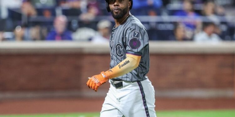 Sep 20, 2025; New York City, New York, USA; New York Mets center fielder Cedric Mullins (28) at Citi Field. Mandatory Credit: Wendell Cruz-Imagn Images