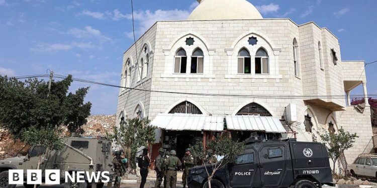 ZAIN JAAFAR/AFP via Getty Images Israeli security forces stand next to their vehicles as they inspect the Hajja Hamida Mosque after it was set on fire and vandalised by Israeli settlers in the Palestinian village of Deir IstiyaZAIN JAAFAR/AFP via Getty Images