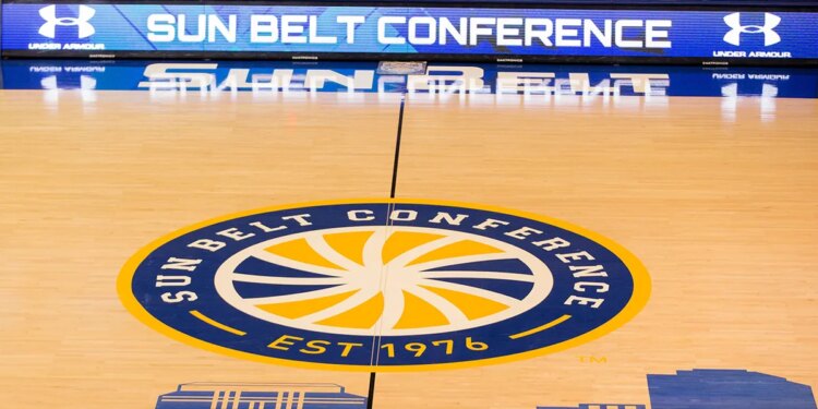 The Sun Belt Conference logo during a game between Arkansas Little Rock and South Alabama at the Lakefront Arena in New Orleans March 12, 2015. (Stephen Lew/Icon Sportswire/Corbis/Icon Sportswire via Getty Images)