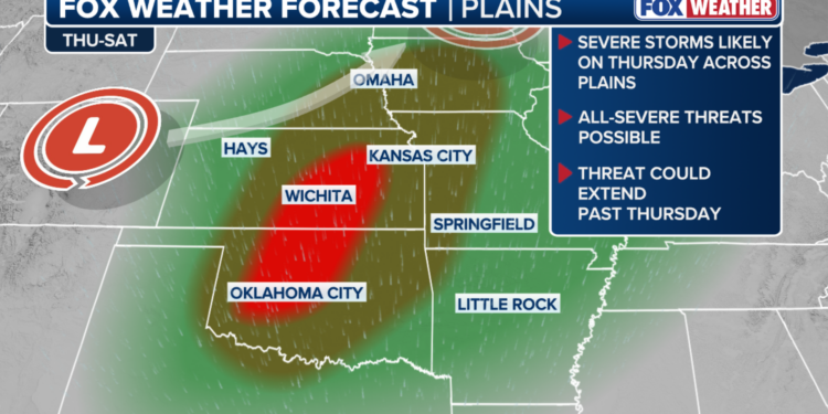 Severe storms reload late this week across portions of the Plains. From Oklahoma north into parts of the Upper Midwest, renewed threats of large hail, damaging winds and tornadoes will all be possible by Thursday. Latest:
