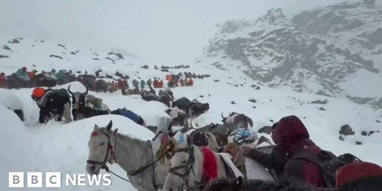 Heavy snowfall that began on Friday evening intensified on the eastern slopes of Mount Everest. The sudden bad weather has also hit Nepal, where torrential rain and flooding killed at least 47 people since Friday.