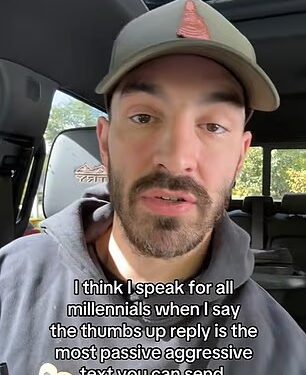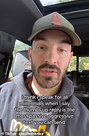 On TikTok, @withethanlap said: ‘The single thumbs up reply text is the most passive aggressive text you can send a millennial.’