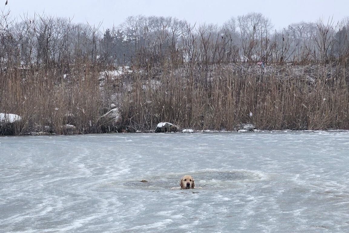 A yellow Labrador out for a walk with his owner in Rhode Island had to be rescued by firefighters on New Year’s Day after he wandered onto a thin layer of ice covering a pond and fell through the center.