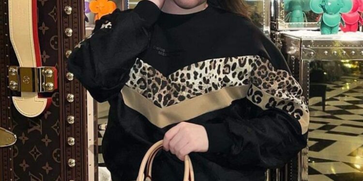 Jack Watkin in a leopard print jacket, black trousers, black loafers, and holding a black handbag, with a Cheshire Police badge watermarked in the upper right.