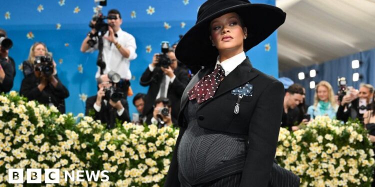 Getty Images Rihanna appears at the Met Gala wearing an outfit tailored to her pregnant stomach. Photographer stand behind a bank of daffodils to snap pictures of her.Getty Images