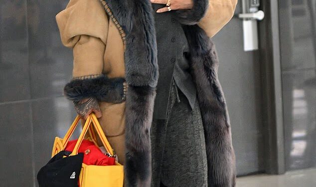 She topped the pieces with a camel-colored coat with decadent dark gray fur trim and accents.