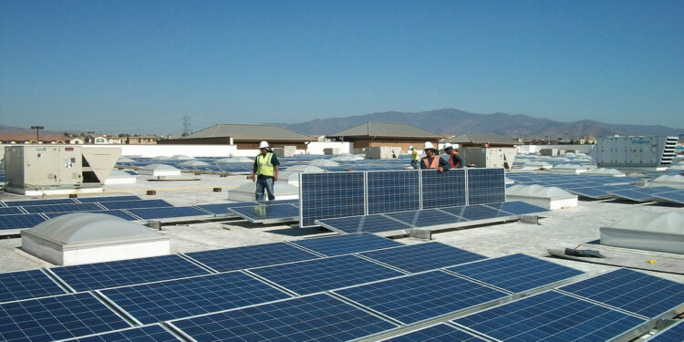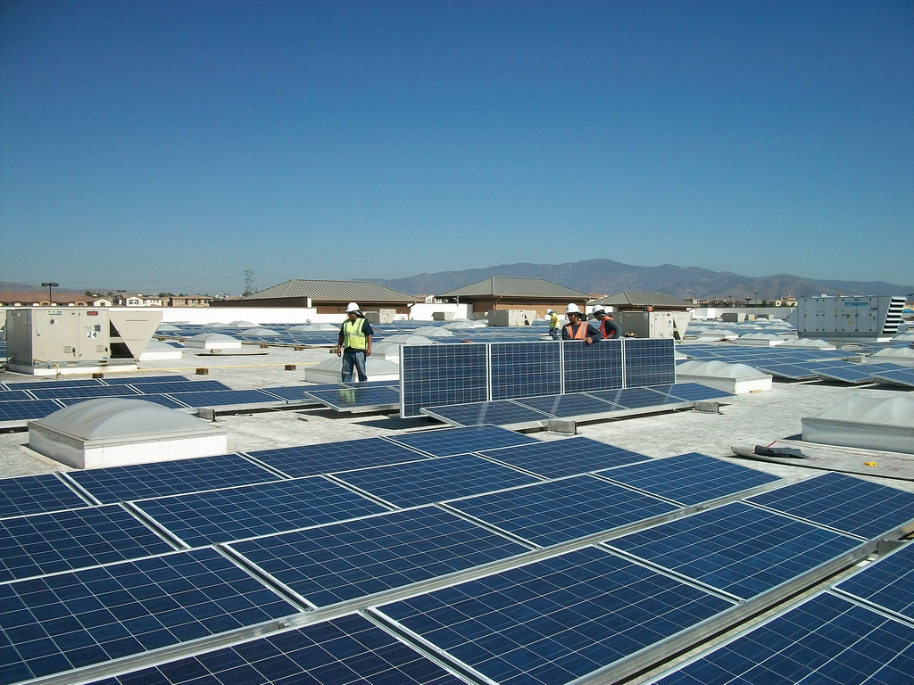 Workers install solar panels on top of a Walmart in Chula Vista, California. Photo by Walmart/Flickr
