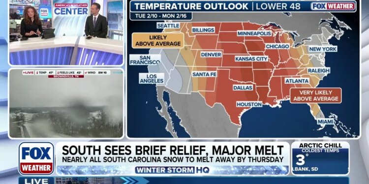 The FOX Forecast Center said temperatures this week will reach the 50s and 60s in the Southeast, providing much-needed relief for Mississippi and Tennessee, where tens of thousands of people are still without power after the historic ice storm.
