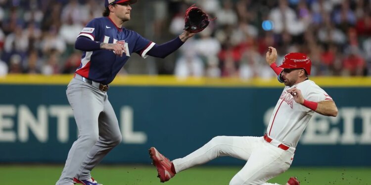 Edouard Julien of Canada slides into second base against Brice Turang of the United States during the fifth inning at Daikin Park March 13, 2026, in Houston, Texas. (Alex Slitz/Getty Images)