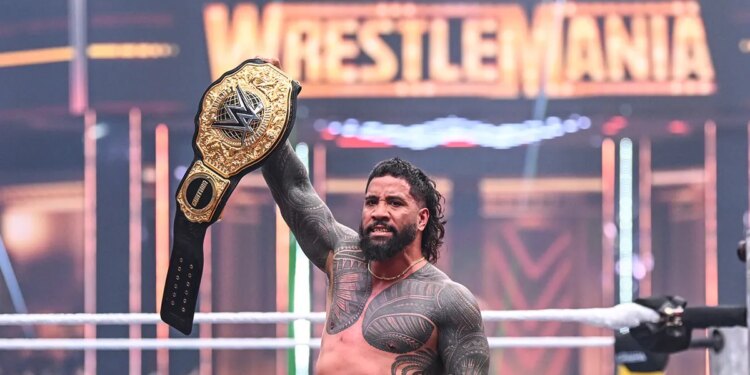 Jey Uso celebrates his win during WrestleMania 41 Saturday at Allegiant Stadium on April 19, 2025 in Las Vegas, Nevada. (Andrew Timms/WWE via Getty Images)