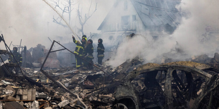 They showed firefighters spraying water on an apartment building in the southern city of Mykolaiv whose roof had been smashed, its shattered beams jutting into the sky like broken ribs. In the Kyiv region, emergency workers walked down a street where the houses on both sides were consumed by fire and debris covered the pavement. In the western Zhytomyr region, photos showed rescuers pulling the bodies of three children from houses that had been reduced to rubble.