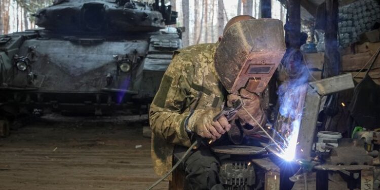 A serviceman of the 57th Separate Motorised Infantry Brigade of the Armed Forces of Ukraine repairs a tank in the Kharkiv region, on August 1, 2025 [Inna Varenytsia/Reuters]