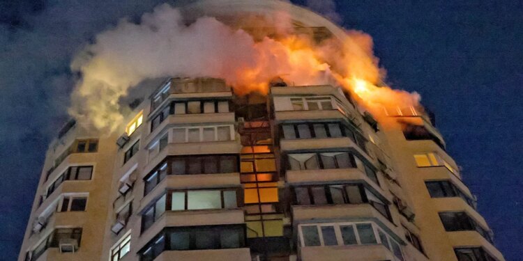 The upper floors of a multi-story building burn after debris from a Russian drone fell in Kyiv, Ukraine, Feb. 3, 2026. (Yan Dobronosov/Global Images Ukraine via Getty Images)