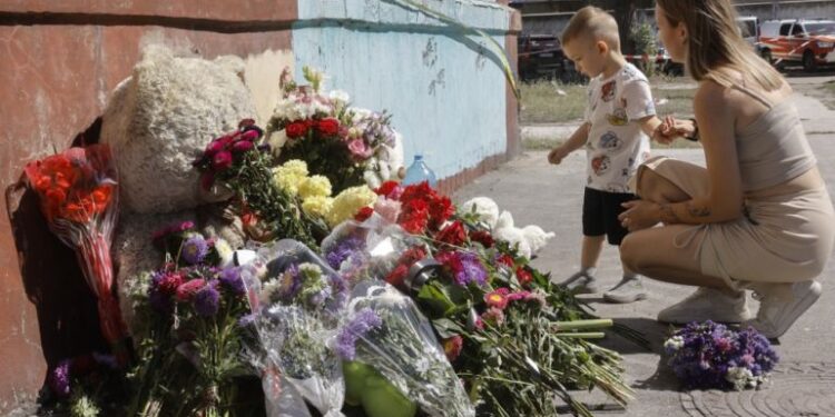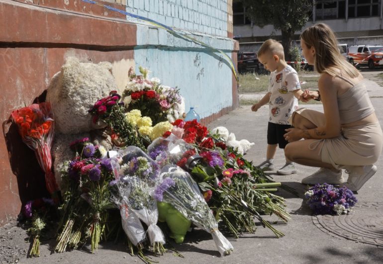 Ukrainians bring flowers and toys at the site of a Russian strike the previous day that hit a five-storey residential building in Kyiv, killing 25 people, including four children, and injuring 50 others [Sergey Dolzhenko/EPA]