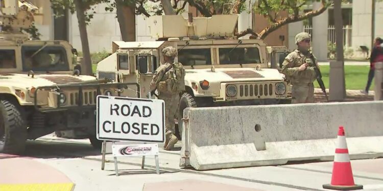 National Guard members and concrete barricades now surround the Ronald Reagan Federal Building and Courthouse in downtown Santa Ana following vandalism earlier this week.