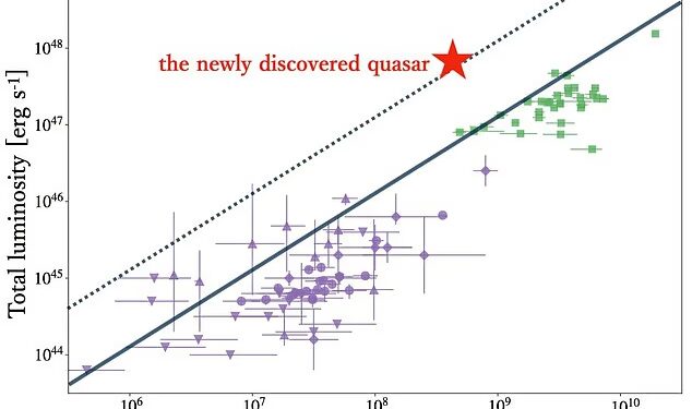 ‘The quasar is pulling in matter at an exceptionally high rate while also emitting intense X–rays and launching a strong radio jet.