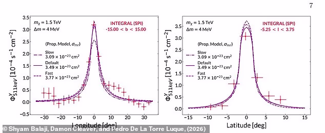 Dr Balaji says: ‘The signal requires positrons with very specific energies of only a few million electron volts. Most conventional astrophysical sources, such as supernovae or cosmic rays, tend to produce particles that are either much more energetic or distributed across the galaxy in the wrong way.