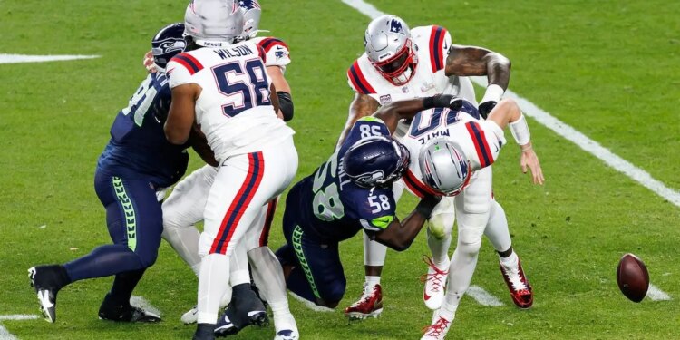 Derick Hall of the Seattle Seahawks strip sacks Drake Maye of the New England Patriots during the third quarter of the NFL Super Bowl LX at Levi’s Stadium in Santa Clara, Calif., on Feb. 8, 2026. (Brooke Sutton/Getty Images)