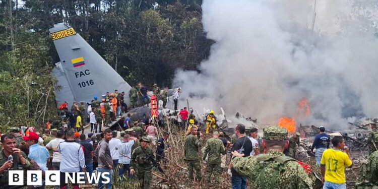 The Hercules military transport plane crashed minutes after take-off near Colombia’s southern border with Peru.