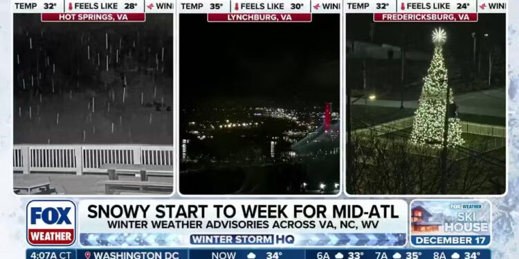 Most of Virginia and northern North Carolina are under Winter Weather Advisories, with 1-3 inches of snow expected.