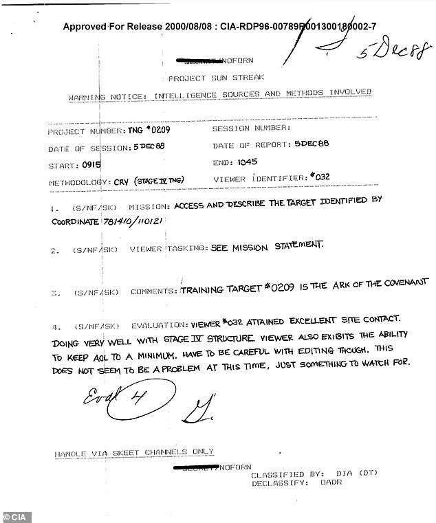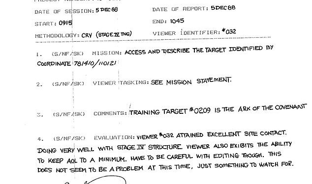 The report details one of these tests where Remote Viewer No. 032 was given coordinates to locate a target, and they described the Ark of the Covenant hiding in the Middle East.