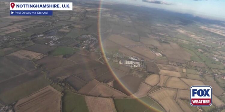 NOTTINGHAMSHIRE, United Kingdom – A rainbow may appear as though it is a half circle, with the middle showcasing its colors across a blue landscape of the sky. However, this common weather phenomenon is actually a full circle.
