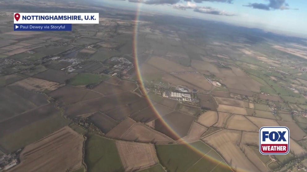 Skydivers in the United Kingdom captured stunning views, showing the true shape of a rainbow from thousands of feet up in the sky.