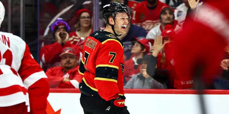 In the second period, after the Red Wings tied the game on Dylan Larkin’s power-play goal, Tkachuk was bloodied on a hit.