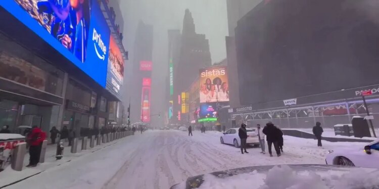 • NEW YORK, NY – JANUARY 25: A taxi driver clears snow off his cab while stopped at a traffic light on Fifth Avenue during a snowstorm on January 25, 2026, in New York City.