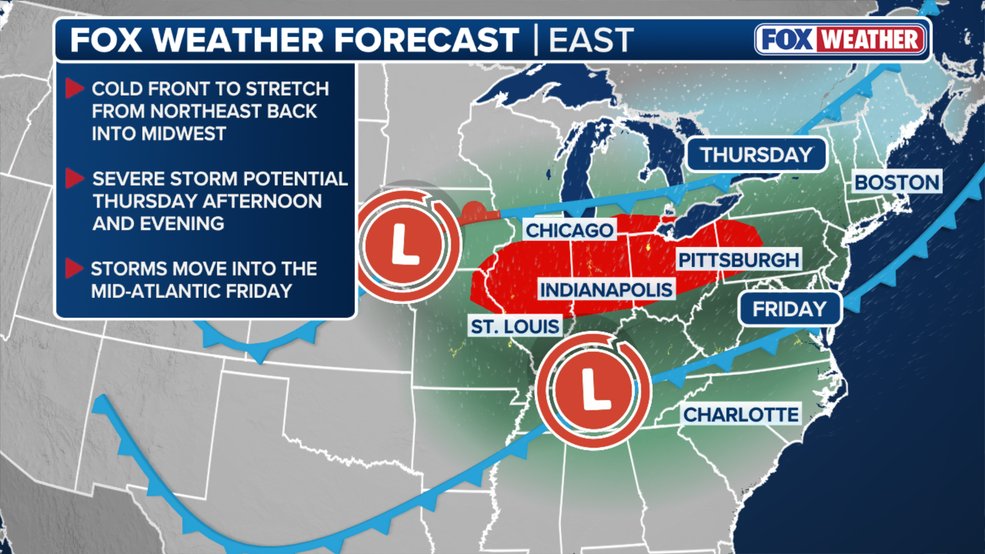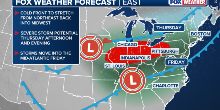 According to the FOX Forecast Center, storms will develop into a line heading into the evening hours — roughly from Pittsburgh to Kansas City, where damaging winds will become the primary concern.