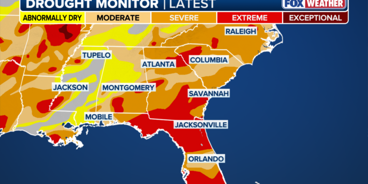 Nearly 100 percent of Alabama is experiencing drought conditions, while Georgia and Florida have reached total drought coverage. Florida, in particular, is experiencing its worst dry spell in 25 years.