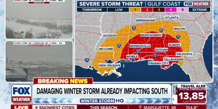 While a massive winter storm plunges much of the country into a deep freeze of ice and snow, the same system threatens the Deep South with a new hazard — severe thunderstorms. A line of thunderstorms is expected to organize Sunday morning across Louisiana and Mississippi, just south of the icing zone, before pushing into Alabama and the Florida Panhandle around midday. By late afternoon, the severe threat will shift into southwest Georgia.
