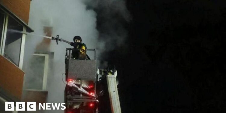 Ukrainian emergency service DSNSIntense Russian drone and missile strikes on cities in Ukraine have left at least six people dead, including two children, President Volodymyr Zelensky has said.
