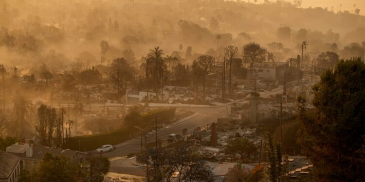 The devastation of the Palisades Fire is seen in the early morning in the Pacific Palisades neighborhood of Los Angeles, Friday, Jan. 10, 2025. (AP Photo/John Locher)