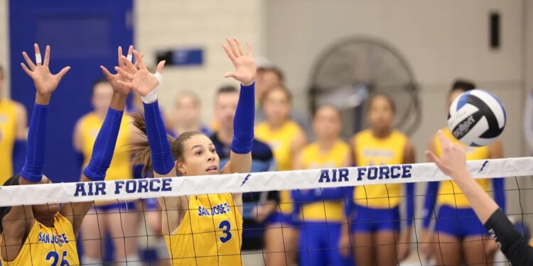 Blaire Fleming of the San Jose State Spartans attempts to block a shot during the first set against the Air Force Falcons at Falcon Court at East Gym on Oct. 19, 2024, in Colorado Springs, Colorado.  (Andrew Wevers/Getty Images)