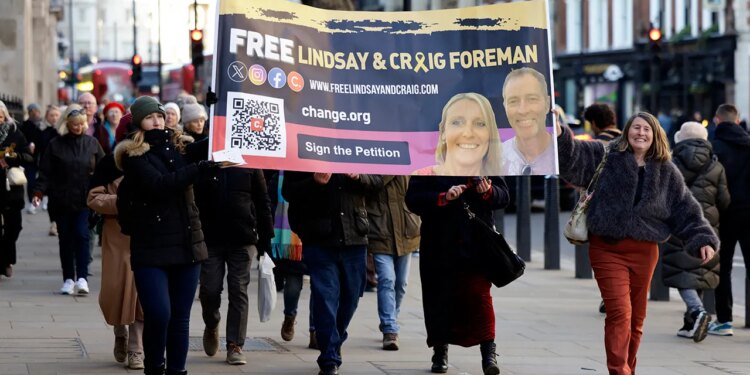 Family and supporters of Lindsay and Craig Foreman hold up a sign in London calling for their freedom in January on the first anniversary of their detention. (Brook Mitchell/AFP via Getty Images)
