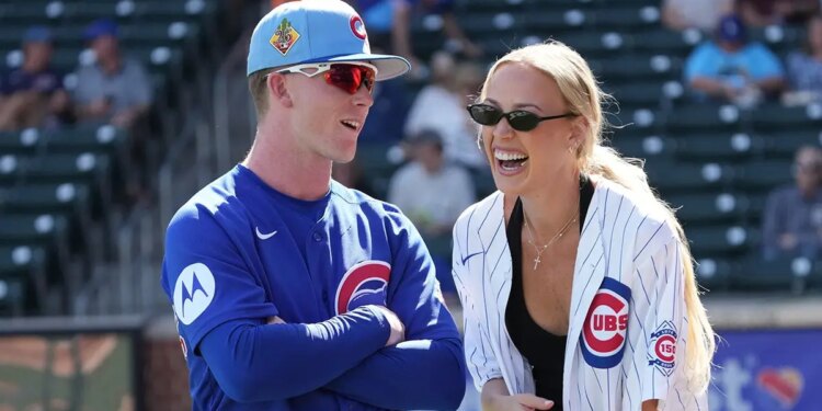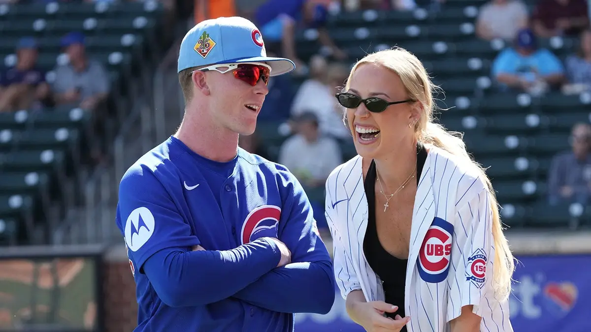 Chicago Cubs center fielder Pete Crow-Armstrong talks to WNBA star Sophie Cunningham before a game against the Colorado Rockies at Sloan Park in Mesa, Ariz., on Feb. 25, 2026. (Rick Scuteri/Imagn Images)