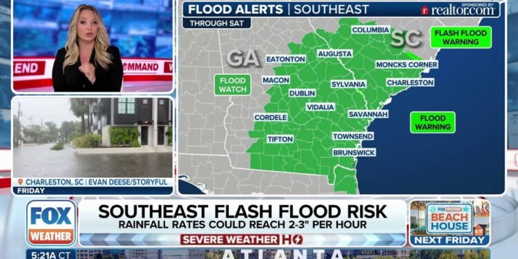NOAA’s Weather Prediction Center again issued a level 2 out of 4 flash flood risk for coastal areas in southeastern South Carolina and Georgia, including Charleston and Savannah, Georgia, for Saturday. Many areas will receive 1-2 inches of rain, but some isolated areas along the coast could see 4-6 inches of rain.