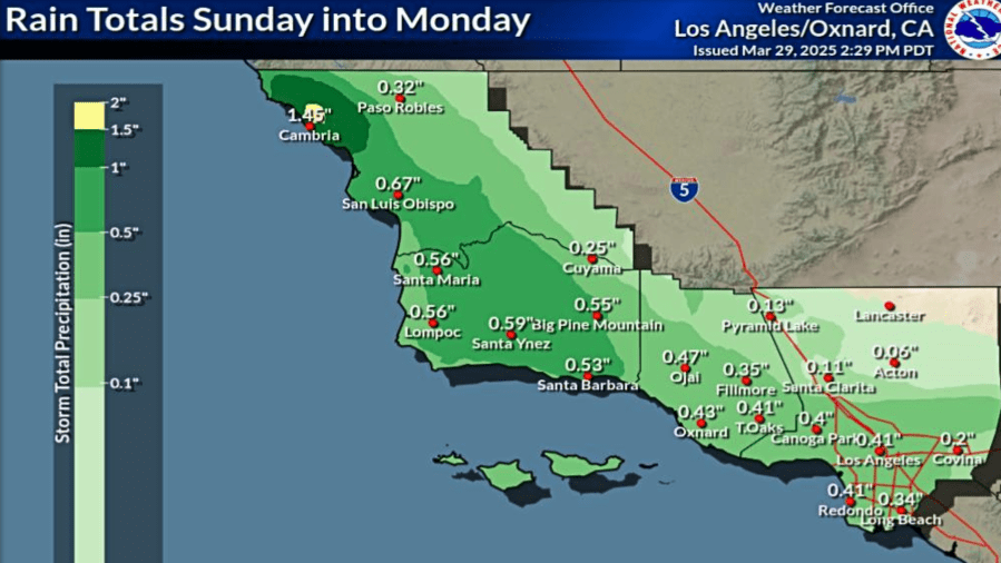 Rain totals are expected to remain relatively light with Monday’s showers bringing around a quarter of an inch or less to most areas of Los Angeles County.