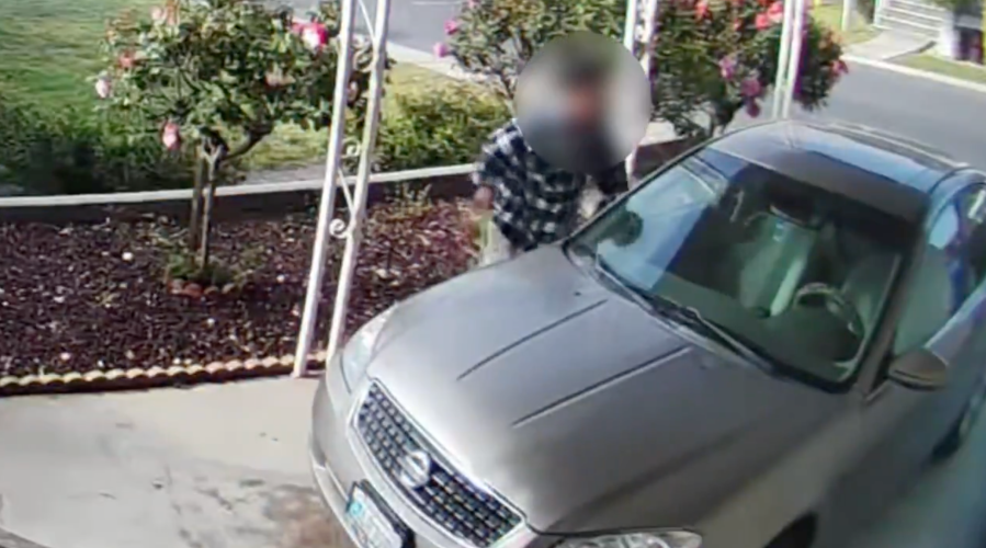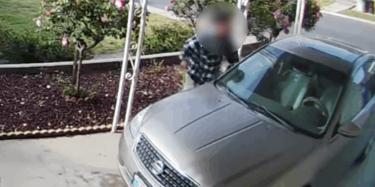 In the footage, the man can be seen bending down toward the front passenger side tire before leaving the camera frame and showing up again at the front driver’s side tire where he, once again, bends over and jabs the wheel with some type of sharp object.