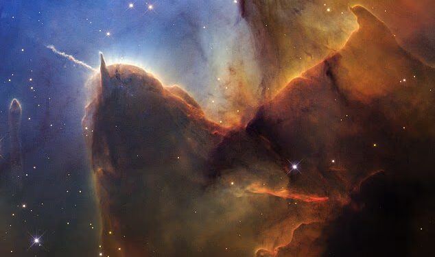 The breathtaking image, captured using Hubble’s Wide Field Camera 3, shows a shimmering cloud of gas and dust where new stars are forming. In visible light, the colours resemble an underwater landscape, with fine particles appearing to drift like sediment through the depths.