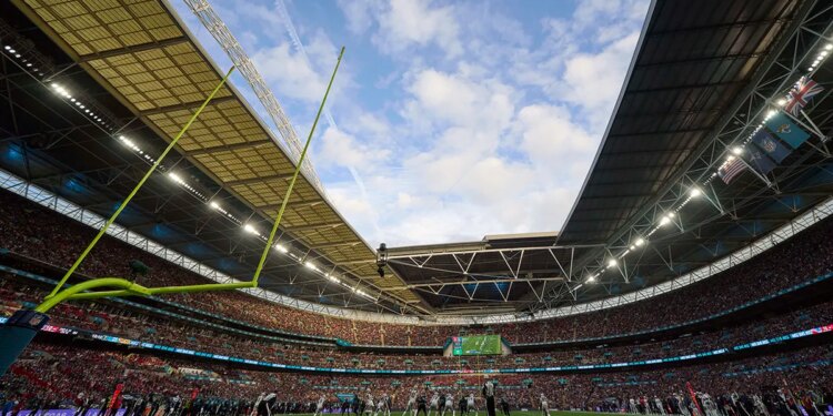 A wide view of play in the first half during an NFL International Series game at Wembley Stadium. (Peter van den Berg-Imagn Images)