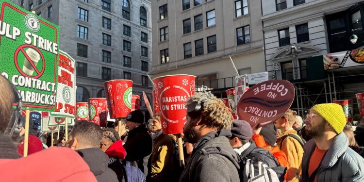 New York City, United States – A passionate crowd of a few hundred people lined the heavily trafficked Fifth Avenue in New York City, cascading with picket signs calling on coffee giant Starbucks to negotiate a contract with its union.
