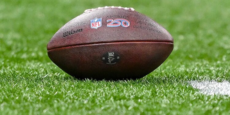An NFL football with the “250” logo commemorating the 250th anniversary during the NFL game between the New Orleans Saints and the Atlanta Falcons at Mercedes-Benz Stadium in Atlanta, Georgia, on Jan. 4, 2026. (Rich von Biberstein/Icon Sportswire via Getty Images)