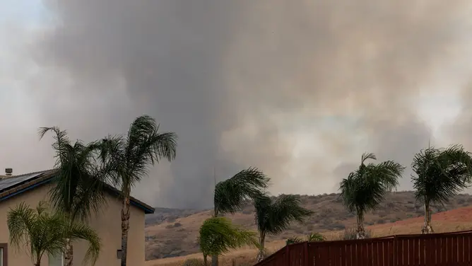 MORENO VALLEY, CA – APRIL 03: Heavy smoke rises from the Springs Fire burning near a residential area on April 3, 2026 in Moreno Valley, California. A fast-moving brush fire east of Moreno Valley grew to about 3,500 acres on April 3, prompting evacuation orders and road closures.