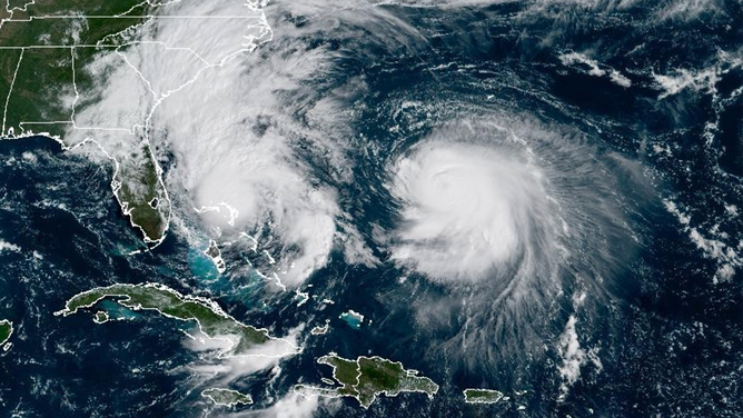 FILE – Tropical Storm Imelda on the left near Florida, and Hurricane Humberto on the right in the Atlantic, both seen by NOAA GOES Satellite on Sept. 29, 2025.